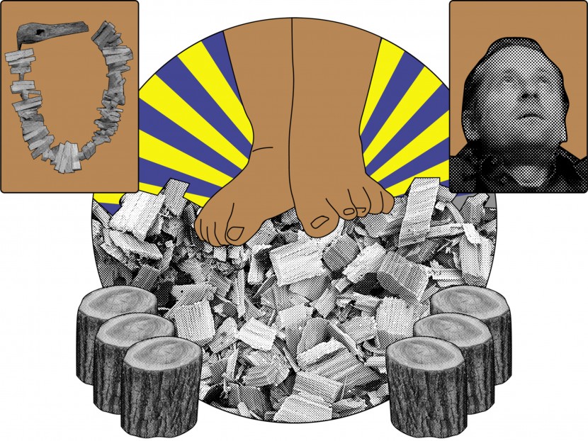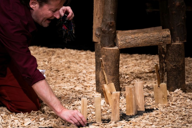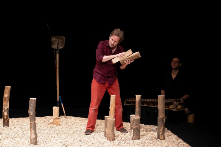 I am on a very big pile of wood. I rub my eyes; I can see logs. They make a kind of path. I go down this path. I come face to face with some very serious logs all in a row. And there are very funny looking musical instruments, also in wood. It's like another planet, see? A planet where there is only wood.