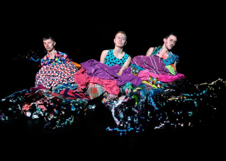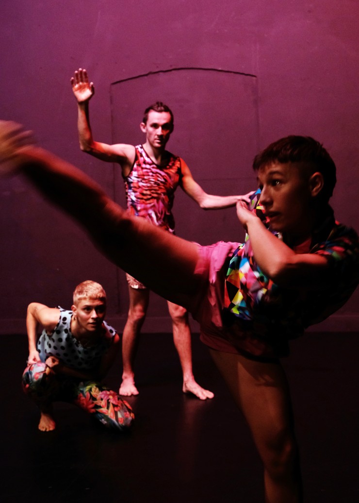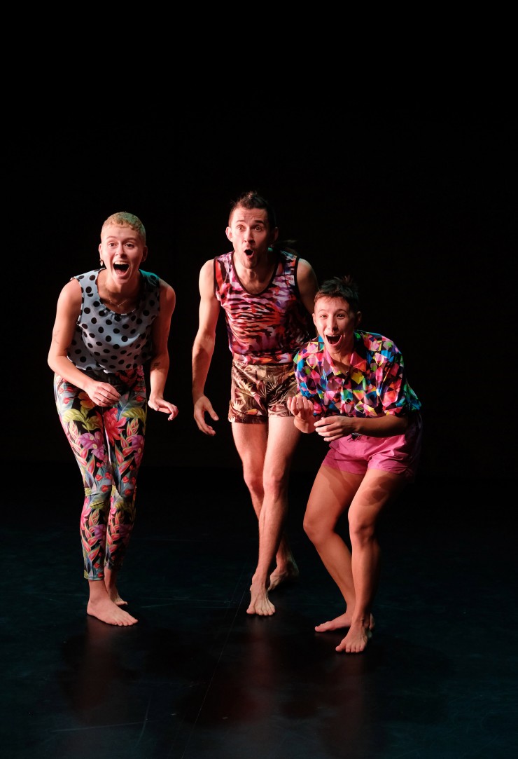 CIE NICOLE SEILER | Conception, chorégraphie : Nicole Seiler | Danse, chorégraphie : Hortense de Boursetty, Colline Cabanis, Gabriel Obergfell | Musique : Stéphane Vecchione | Travail de voix : An Chen | Lumière : Antoine Friderici | Scénographie, vidéo : Vincent Deblue | Costumes : Cécile Delanoë | Collaboration dramaturgique : Muriel Imbach | Direction technique, régie : Vincent Deblue | Administration : Laurence Rochat | Diffusion : Michaël Monney