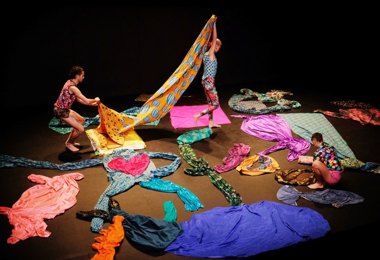 La scène est pleine de tissus étalés par terre. Il y en a des roses brillants, des rayés noir et blanc. Il y en a des à pois, des à fleurs.